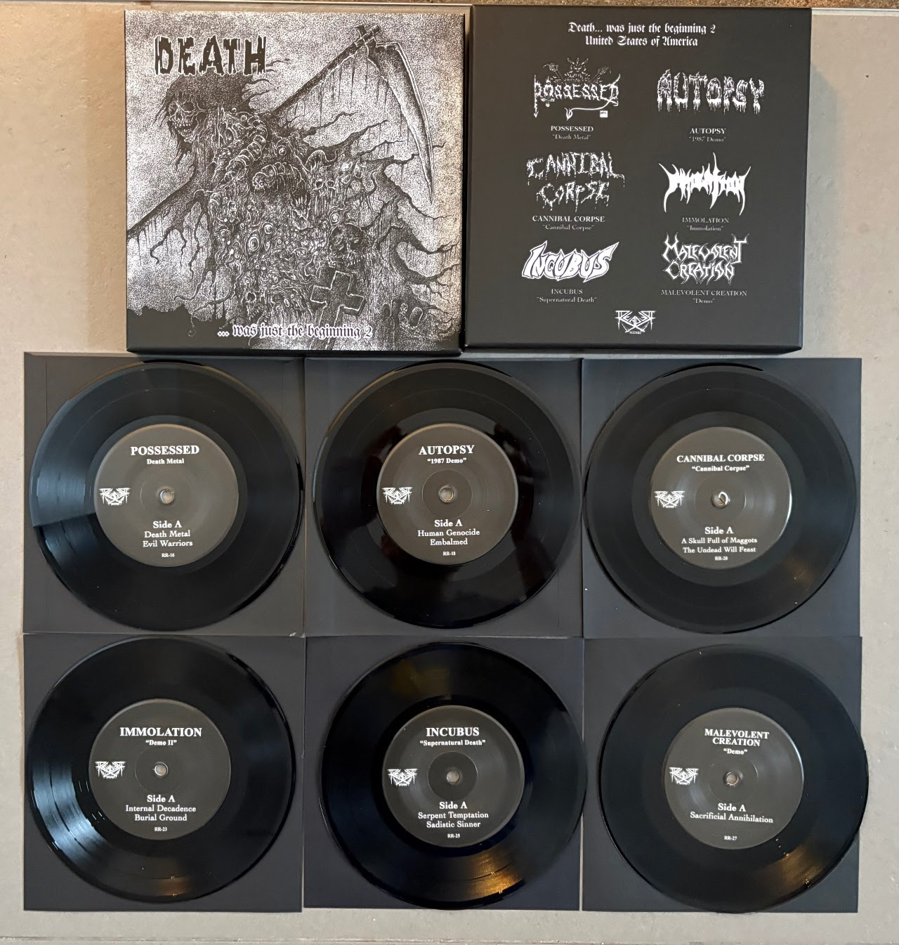 Here comes another 7" boxset glorifying the old days when Death Metal crawled from the deep abyss to show the world what Extreme Music can sound like. Housed in a rigid box with another exclusive artwork, the second part pays tribute to another important scene: the United States. This limited and hand-numbered box comes with another exclusive artwork and will contain these six 7"s which come in two versions: